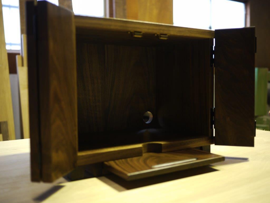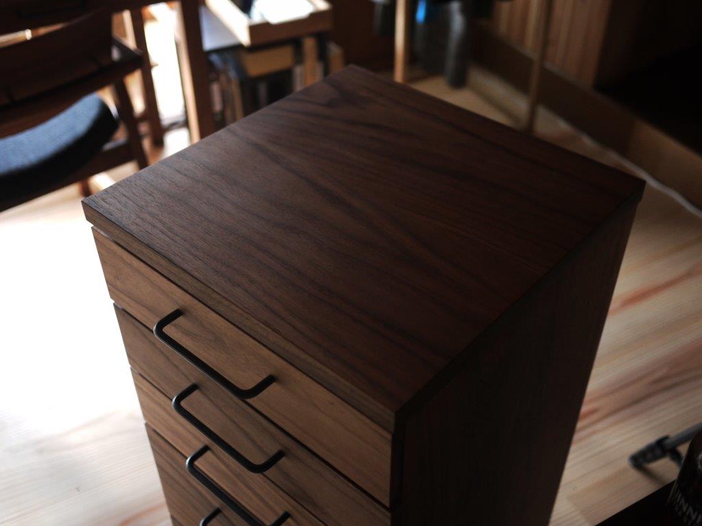 ウォールナット無垢材、鉄黒染め 寸胴ツマミ(取っ手)、ウォールナット突板(扉、棚板)