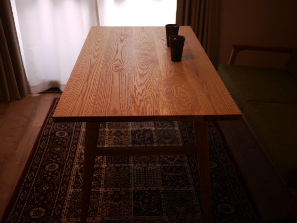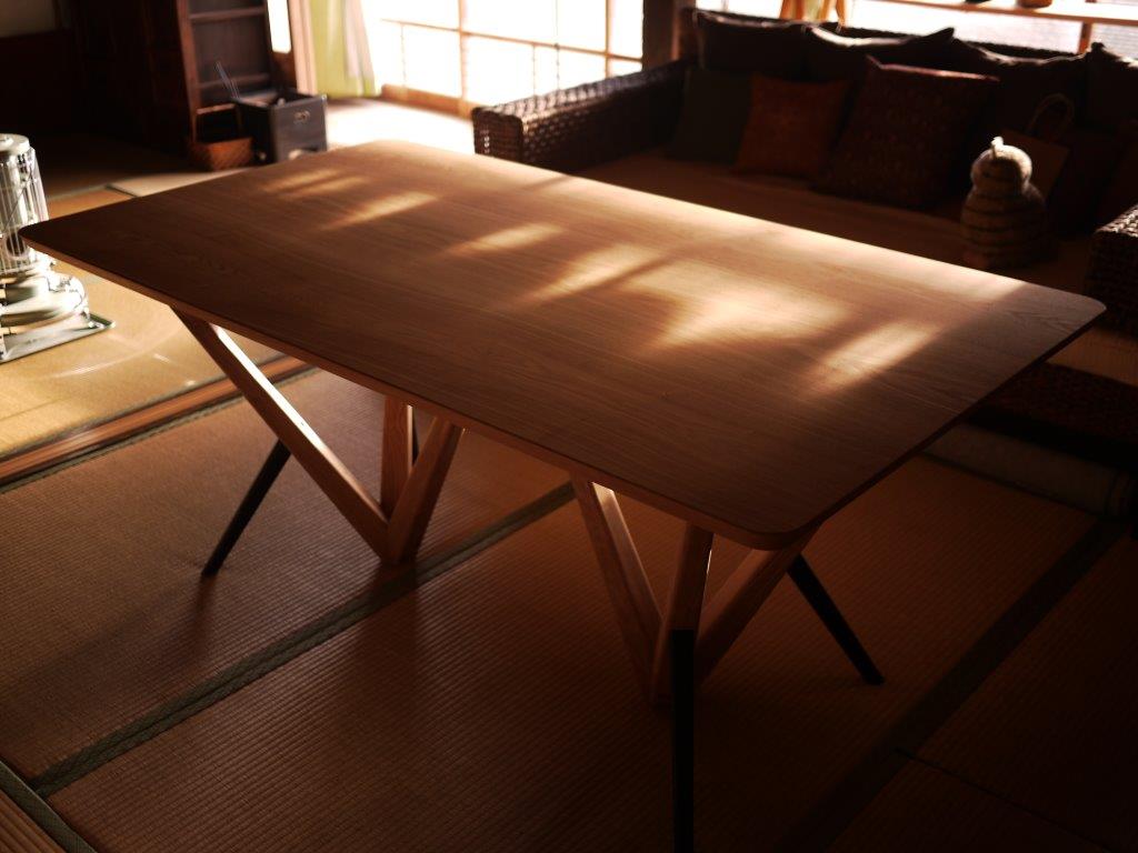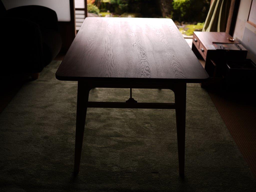 吉野杉無垢材(天板)、ウォールナット無垢材(脚部)、タモ無垢材(構造材)
