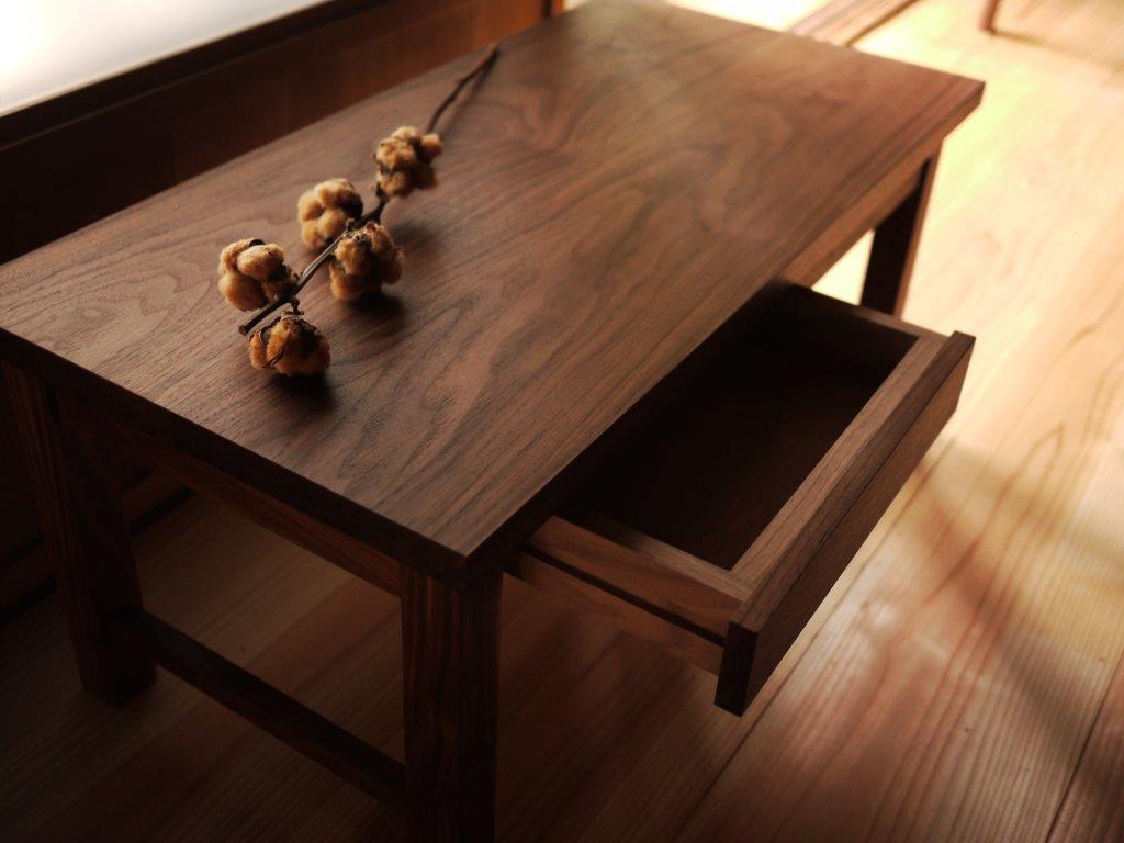 ウォールナットの文机。四畳半ほどのコンパクトな打ち合わせスペースに