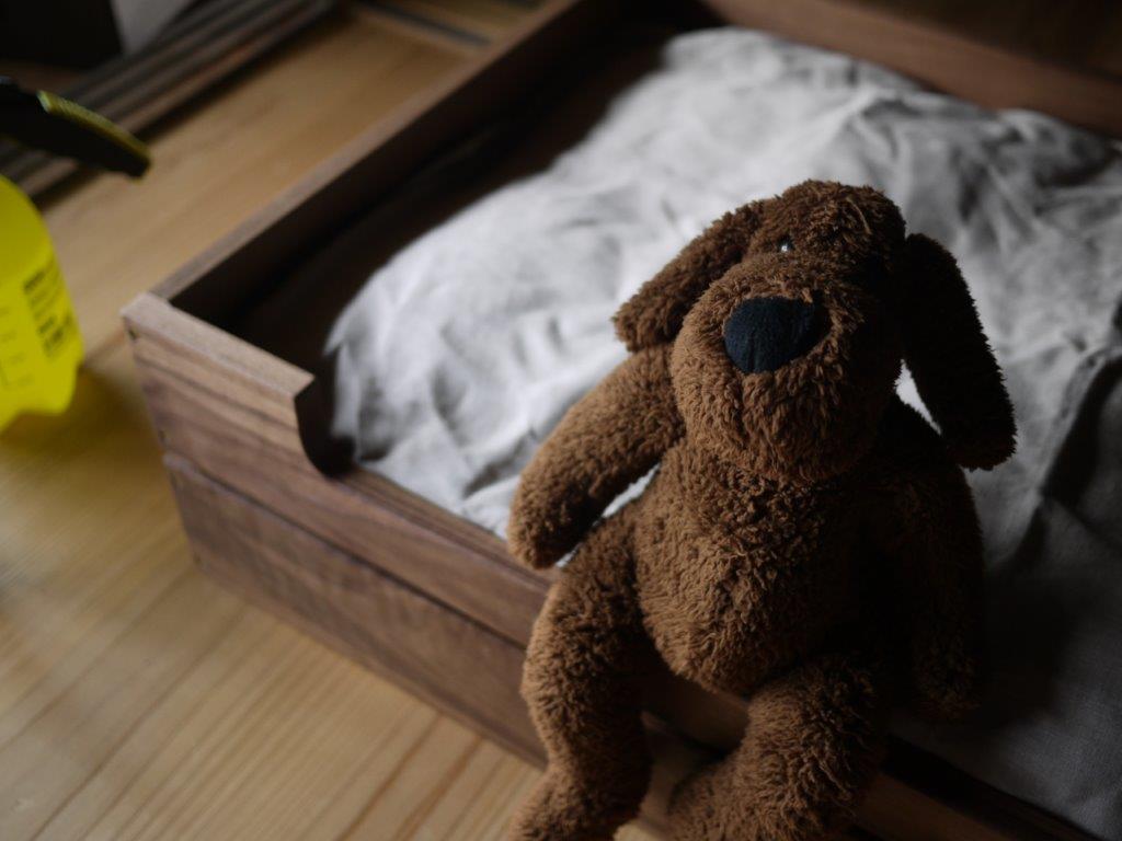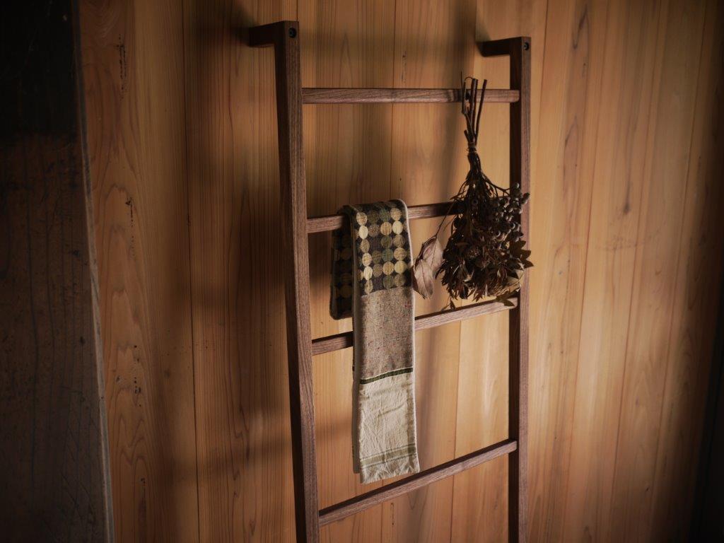 ウォールナット無垢材、ひのき無垢材(すのこ部)、真鍮、オイルフィニッシュ(OSMO)